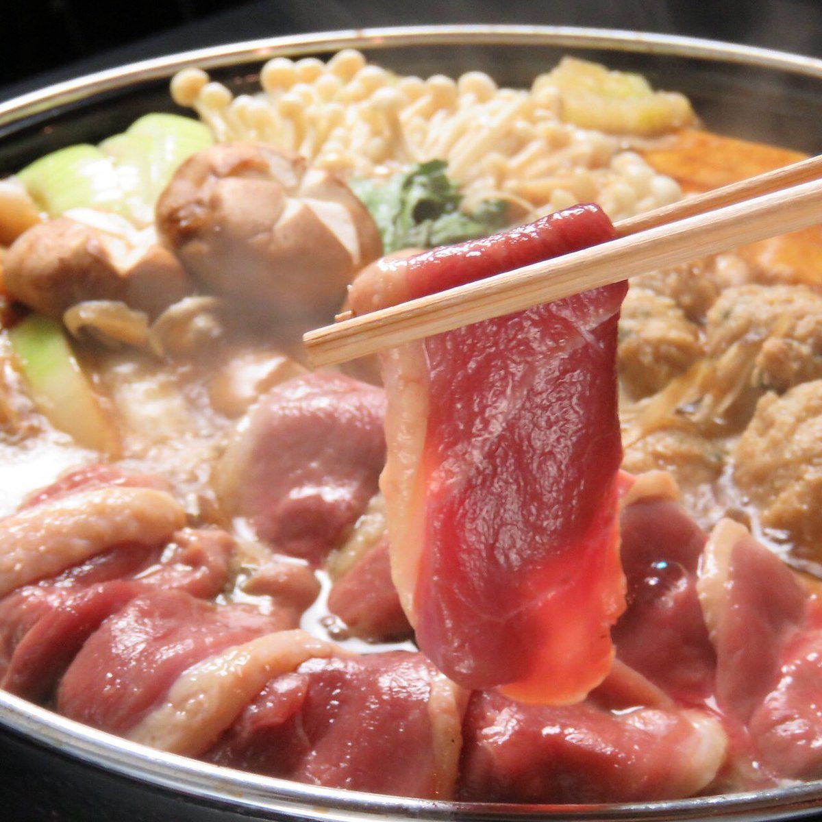 【鴨すき焼き鍋 コース】120分飲み放題付き7品5500円→4500円🌟はじめに新鮮な鴨肉を焼いて地鶏の溶き卵とお召し上がり下さい。その後、媛っこ地鶏のガラを使用したスープで作った、当店自慢の甘辛い割り下で新鮮な愛媛産の野菜を入れ鴨の肉の味を余すことなく存分に堪能してください🎶🍲