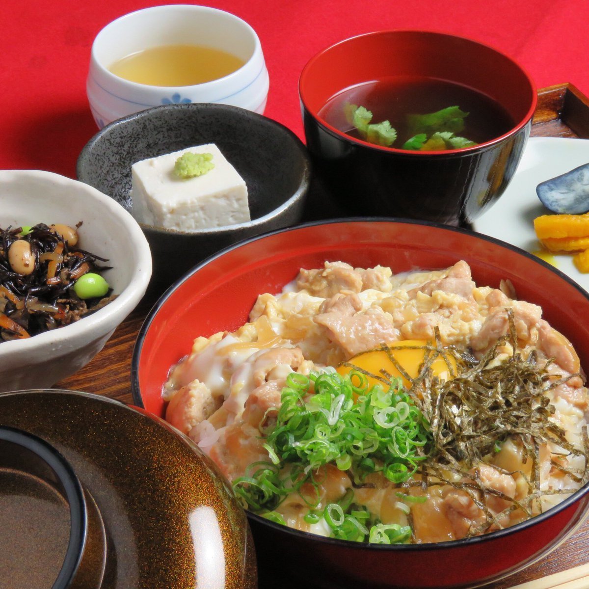 半熟とろふわ親子丼。半熟卵がたっぷりそのうえから卵黄を割り入れています。煮物・お味噌汁・小鉢・漬物がついていますよ🌟🎶