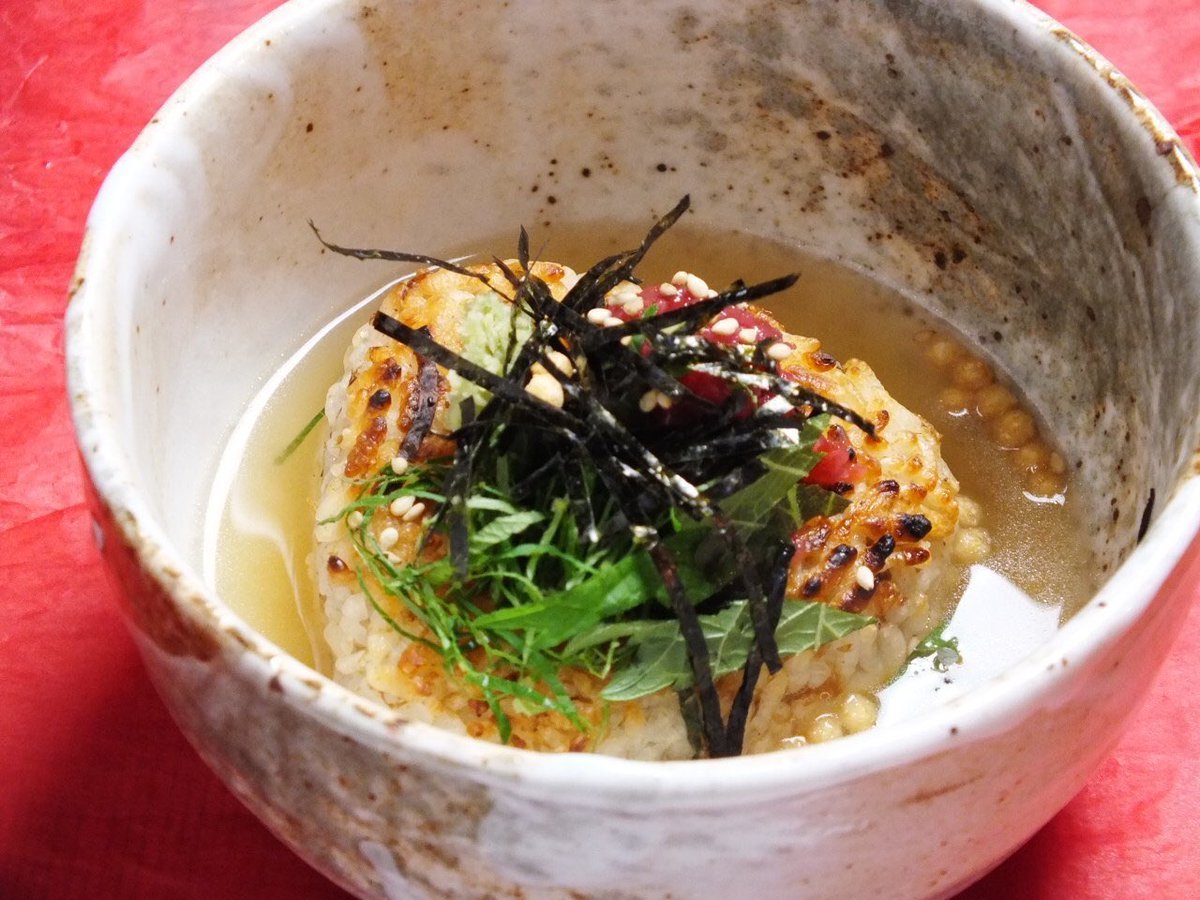 炭の香りをまとった香ばしい焼きおにぎりをお茶漬けにしました!