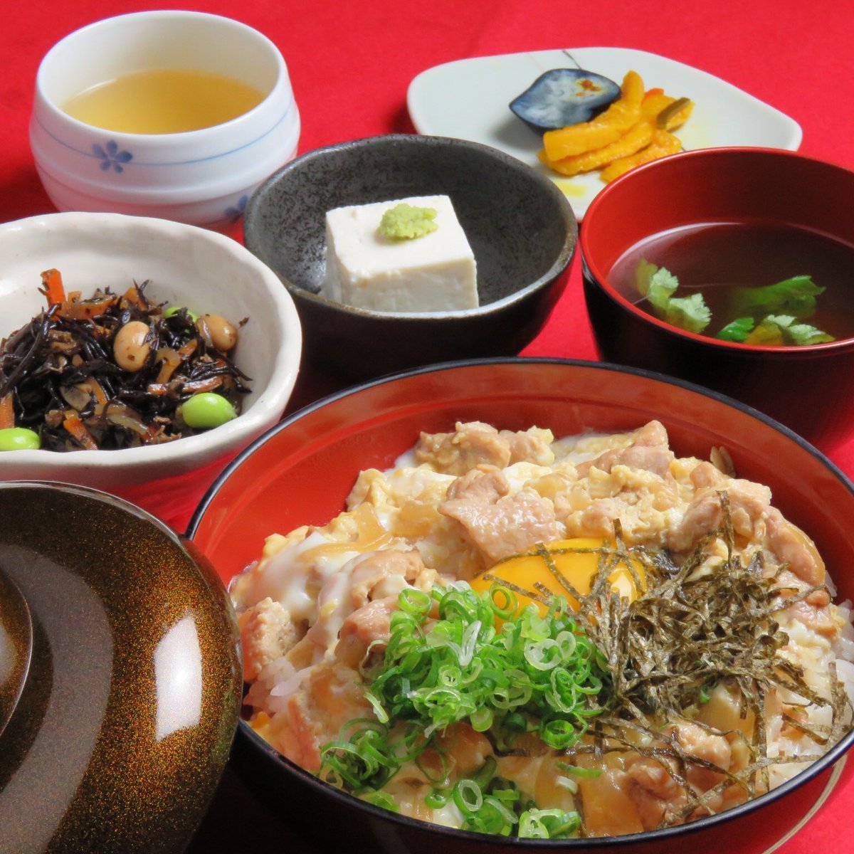半熟とろふわ親子丼。半熟卵の真ん中に卵黄を割り入れています。煮物・お味噌汁・小鉢・漬物がついています。