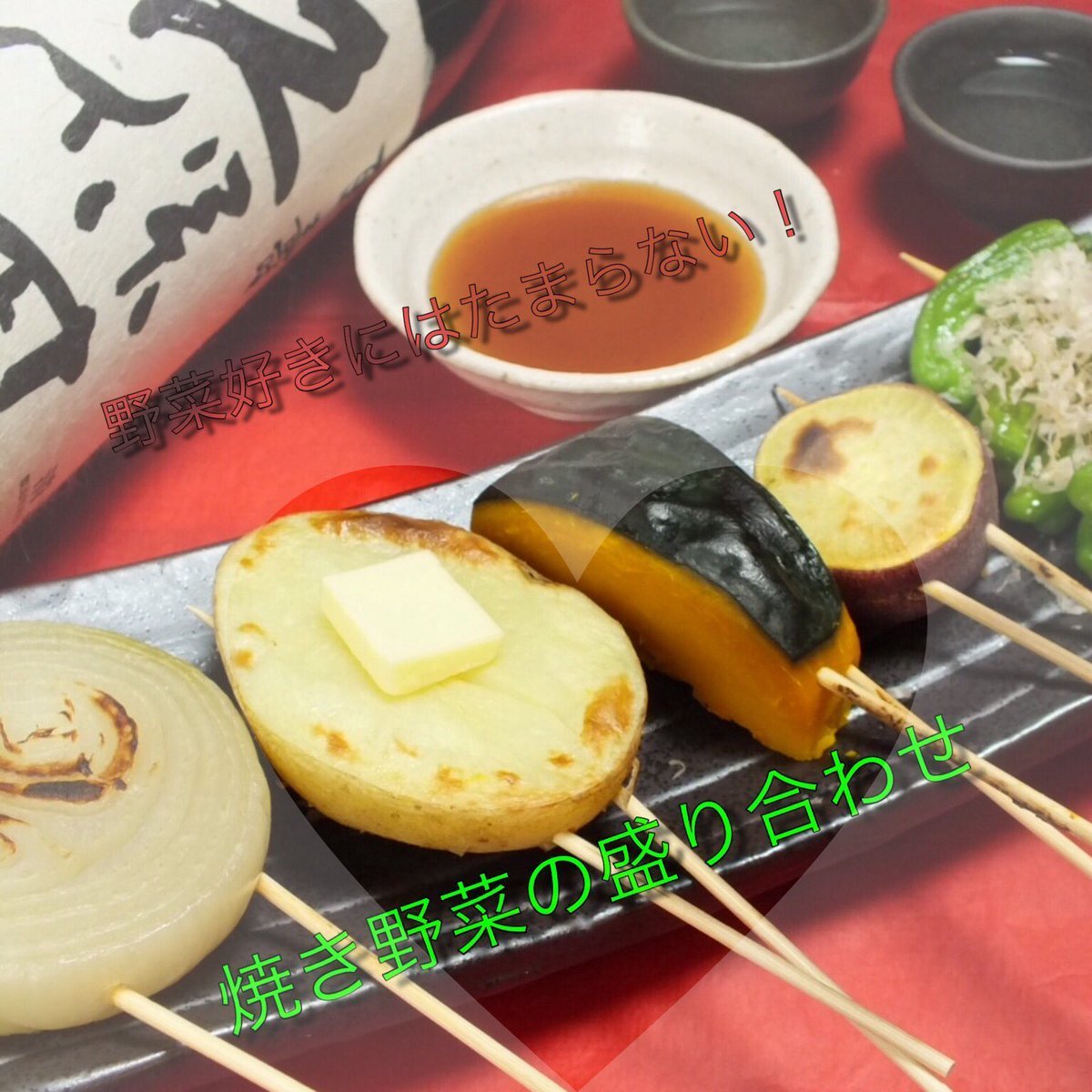 愛媛の美味しい野菜が串焼きに!彩り豊かな焼き野菜は焼き鳥や唐揚げとも相性抜群です。ヘルシーで女性からも大人気の盛り合わせです👍✨