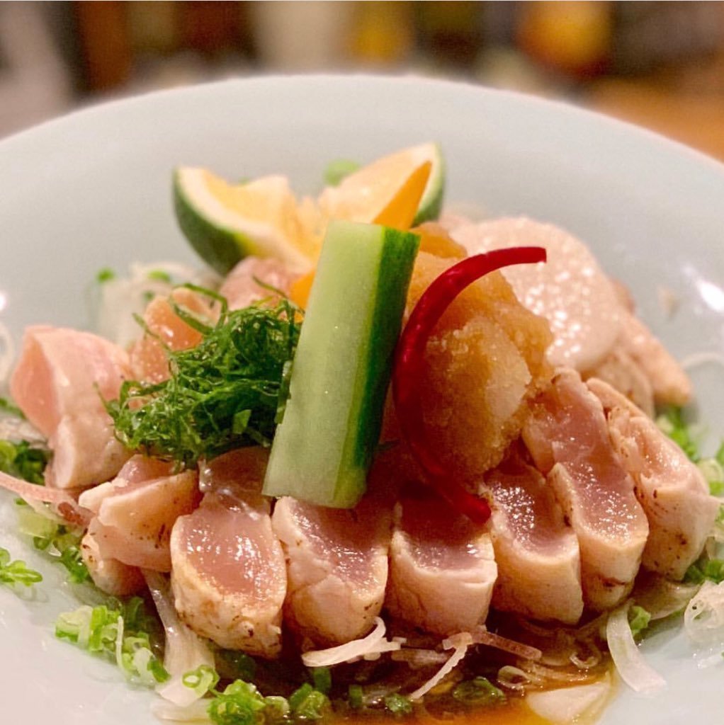 新鮮な朝じめのササミを炙り自家製のポン酢で食べて頂きます🤤たっぷり薬味との相性もバツグンです❗️