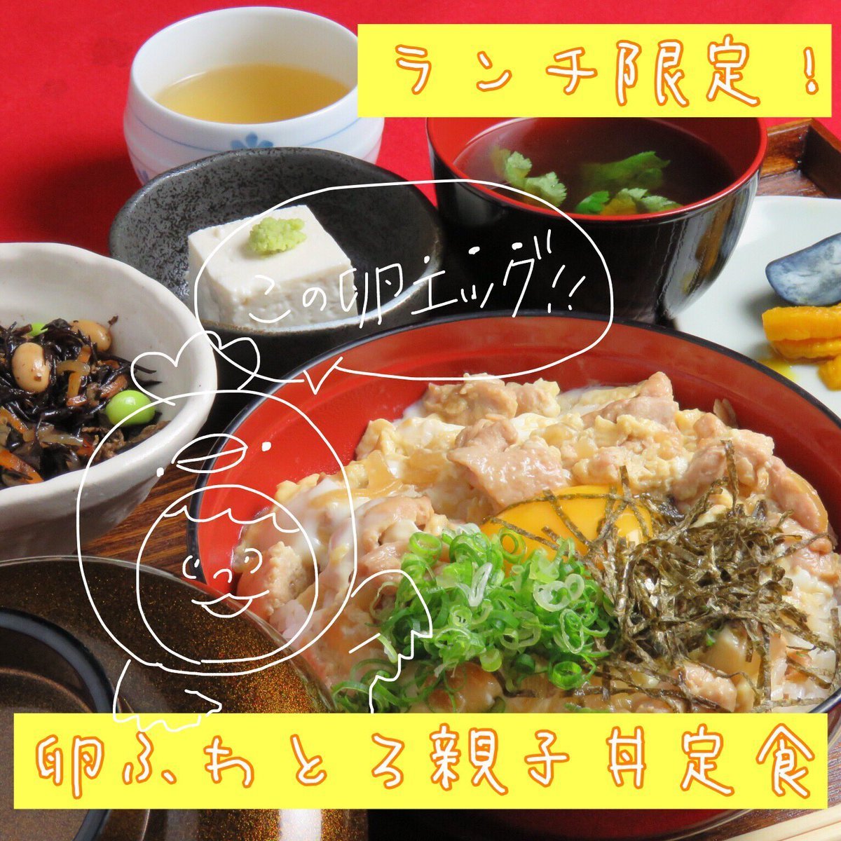 半熟とろふわ親子丼🐓半熟卵の真ん中に卵黄を割り入れています。煮物・お味噌汁・小鉢・漬物がついています。😋