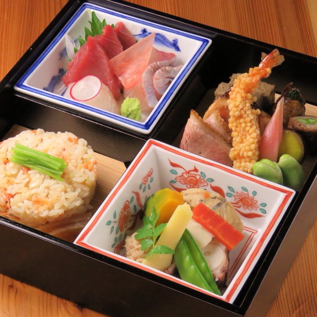 松花堂弁当(竹)は、天ぷらとお吸い物がセットになります。